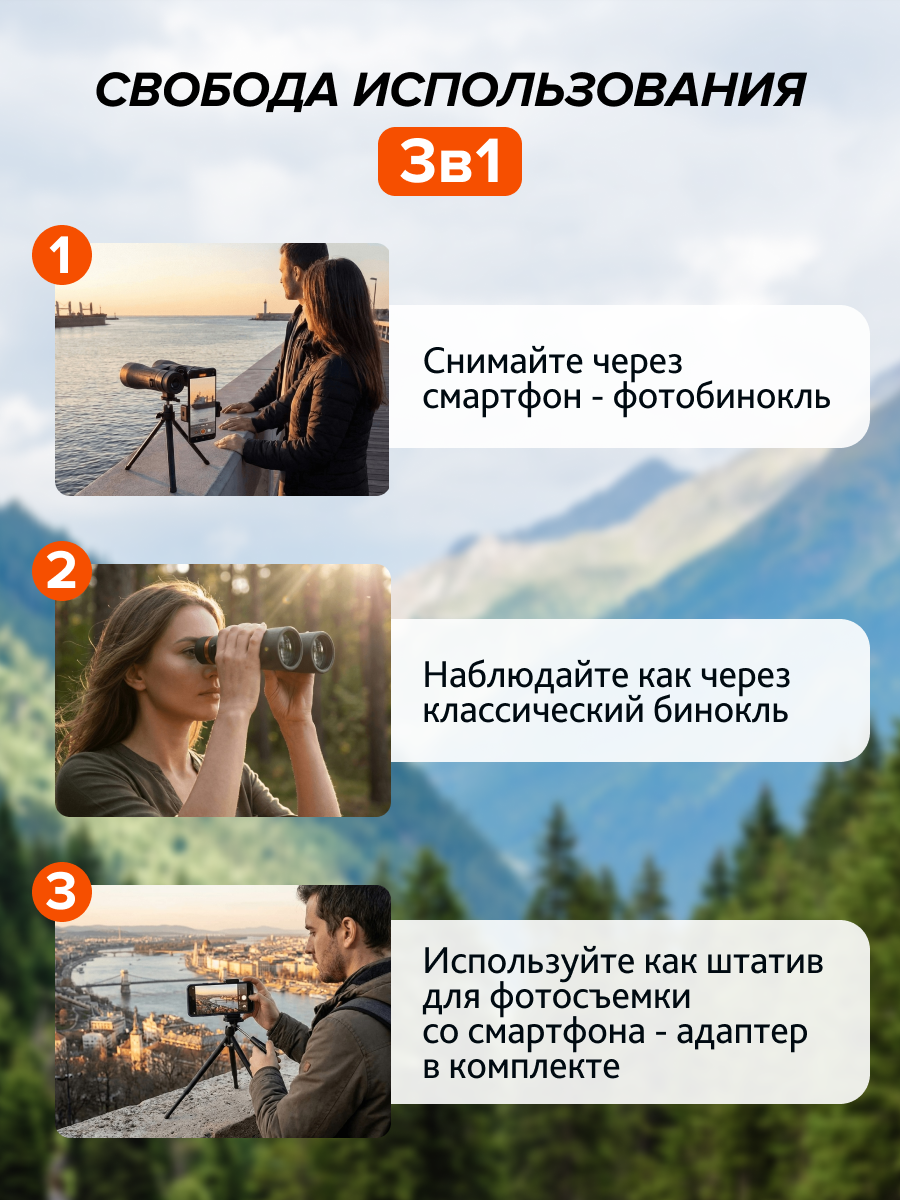 Ďalekohľad môžete používať dvoma spôsobmi - ako bežný binokulár na pozorovanie alebo po pripojení telefónu ako optiku na mobilné foto a video. Displej telefónu poslúži ako živý náhľad, čo uľahčuje kompozíciu aj okamžité zdieľanie výsledkov.